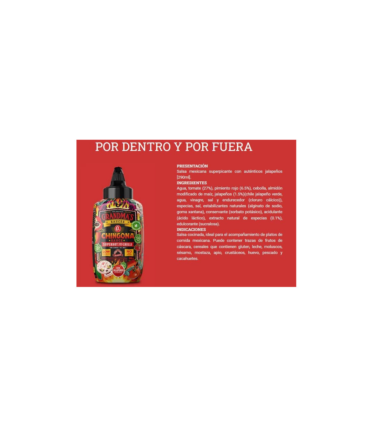 ¿Estabas hasta los frijoles de no encontrar una buena salsa picante y apta para acompañar tus dietas? Lanza un grito al más puro estilo ay, ay, ay! y atrévete con nuestra Grandma´s Mexican Chingona Sauce con auténticos jalapeños... ¡extremadamente picante!