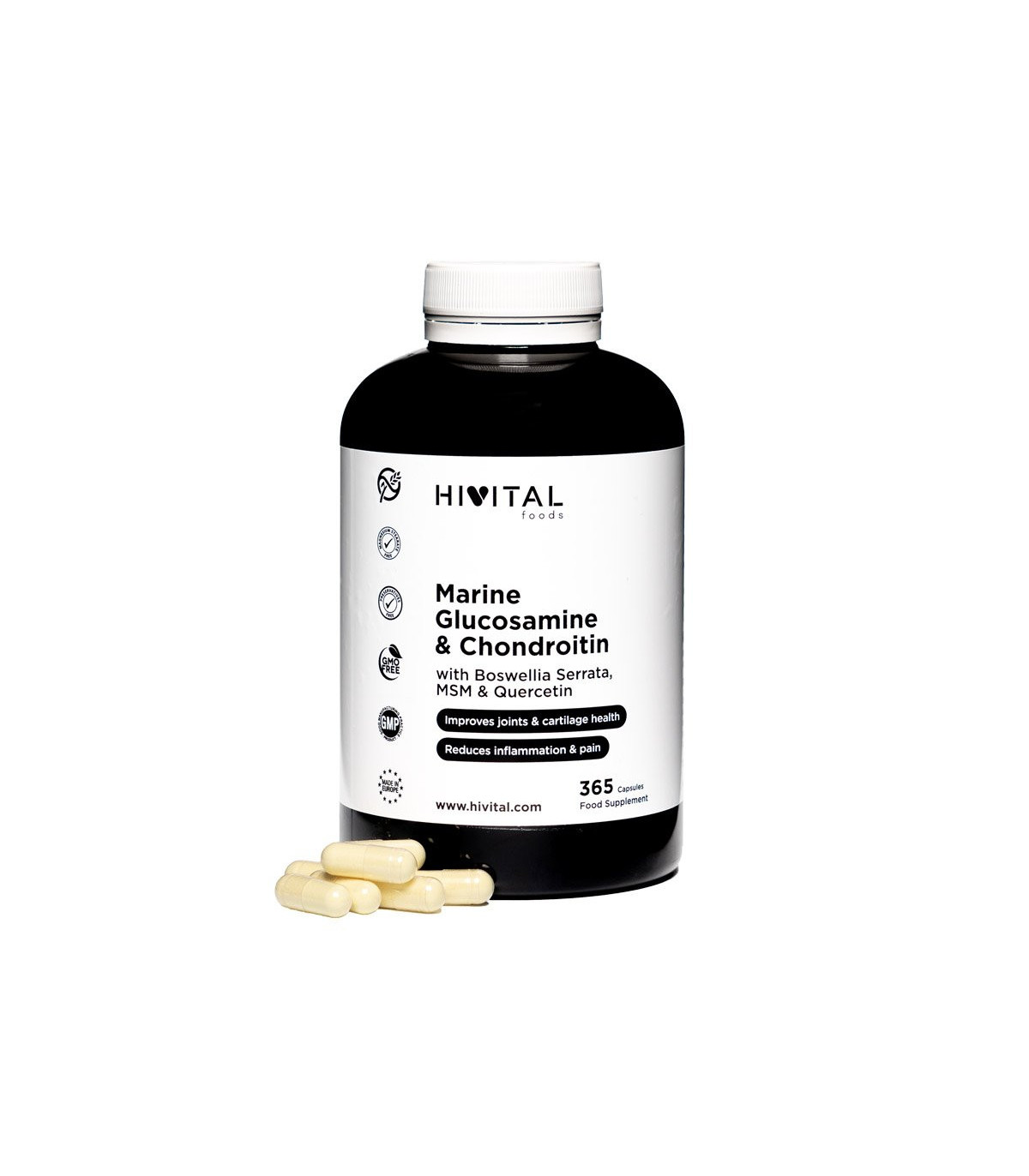 EXCELENTE FÓRMULA a base de Glucosamina Marina, Condroitina Marina, Extracto de Boswellia Serrata, MSM (MetilSulfonilMetano) y Extracto de Quercetina. | Potente antiinflamatorio que reduce el dolor articular de rodillas, cadera, espalda y mandíbula, ayudando a regenerar el cartílago. | Nuestra Glucosamina con Condroitina está especialmente indicada para tratar los síntomas de la osteoartrosis, artritis y fibromialgia.