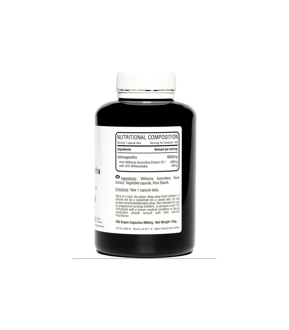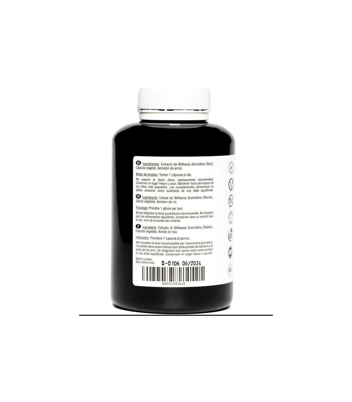 Extracto de raíz de Withania Somnifera, Cápsula vegetal, Almidón de arroz.