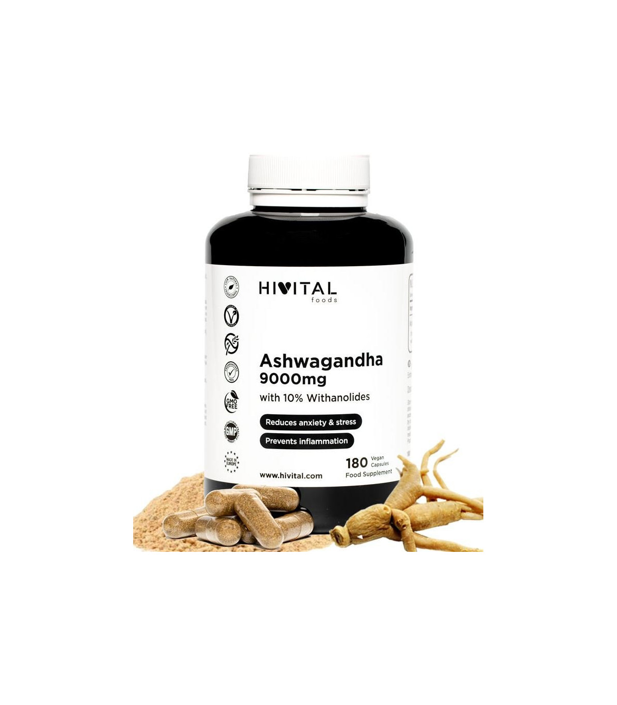 LA MEJOR ASHWAGANDHA: Cada cápsula contiene 9000 mg de Ashwagandha elaborada a partir de 600 mg de extracto natural de la raíz de Withania Somnifera 15:1 certificado al 10% en Witanólidos.