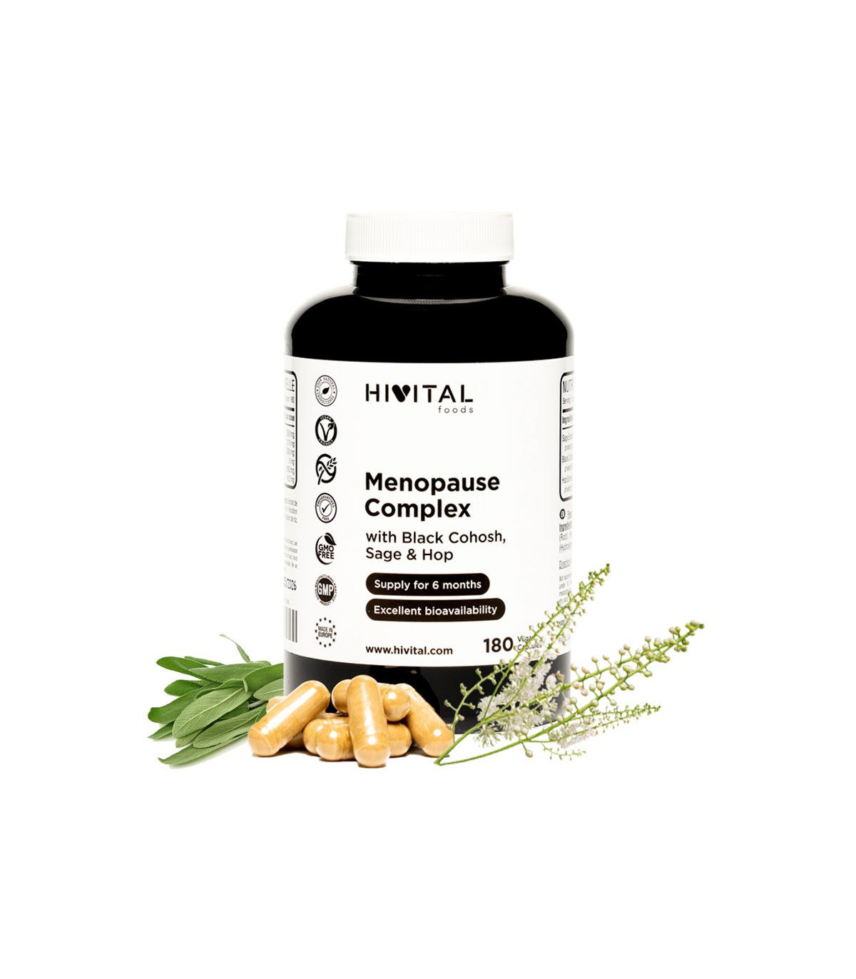 EL MEJOR MENOPAUSE COMPLEX: Cada cápsula está elaborada con 350 mg de Extracto Natural de Hojas de Salvia Officinalis 12:1 al 2.5% en Ácido Rosmarínico aportando 8,75 mg de Ácido Rosmarínico, 200 mg de Extracto Natural de Raíz de Cimicífuga Racemosa 5:1 al 2.5% en Glucósidos Terpénicos aportando 5 mg de Glucósidos y 160 mg de Extracto Natural de Estróbilo de Lúpulo (Humulus Lupulus) 12:1 al 12% en Flavonas aportando 19,20 mg de Flavonas.