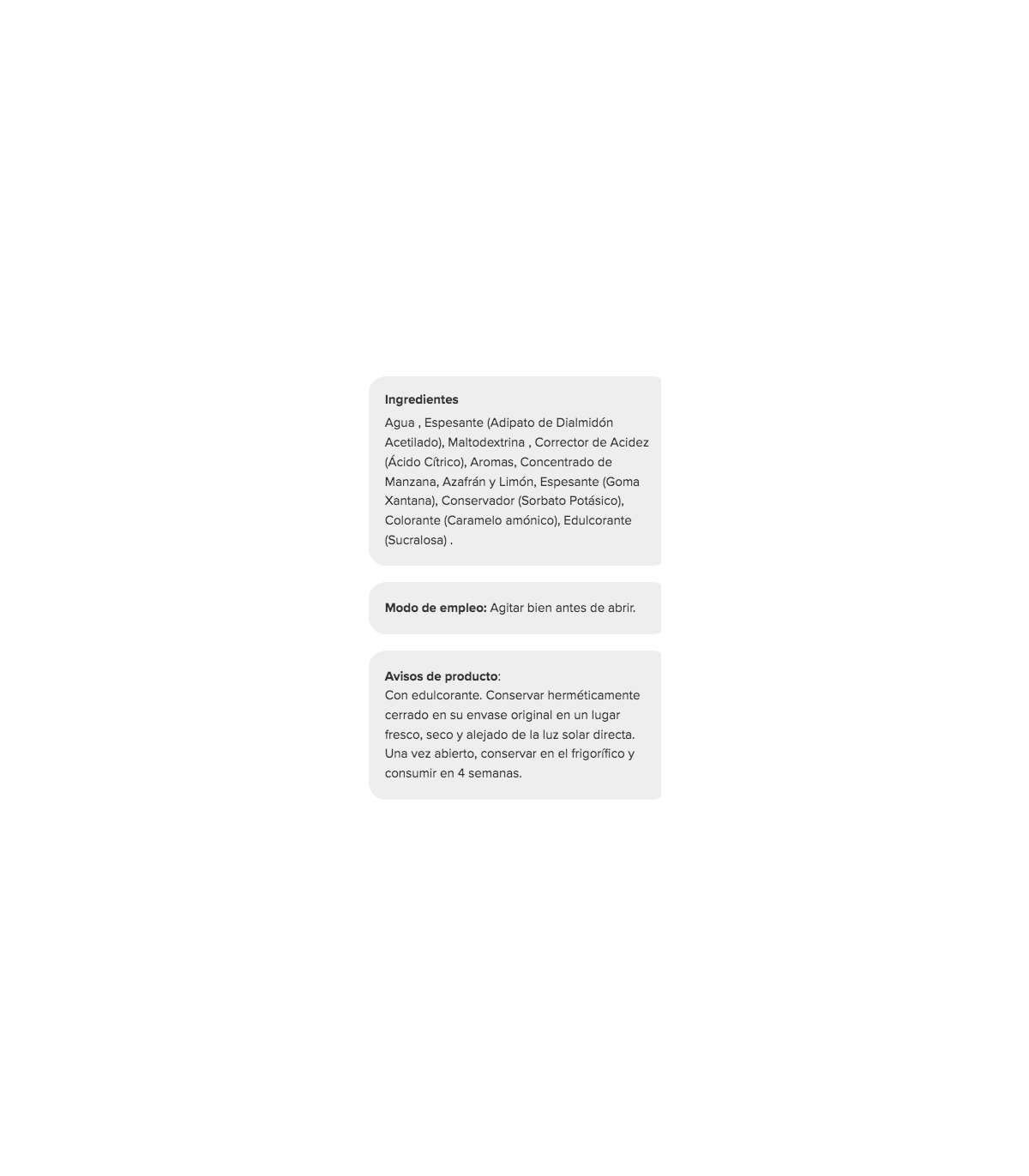 - 0,1 g de azúcares. .Adecuado para dietas.