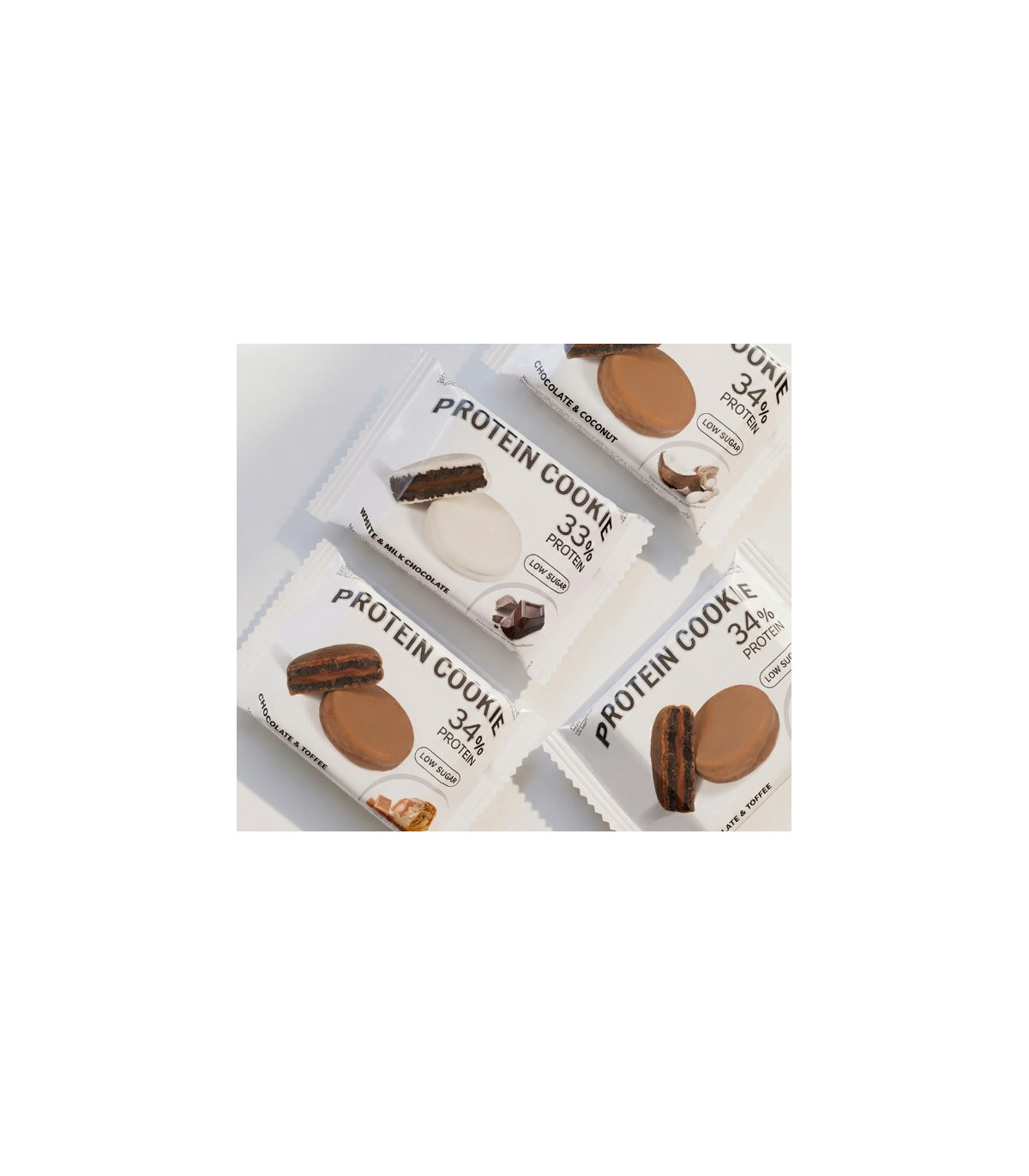 Protein Cookie son galletas rellenas sustitutivas que pueden perfectamente complementar una dieta de control de peso, apenas aportan 1,6g. De hidratos de carbono por galleta y hasta un 34% de proteínas de suero. No contienen azúcares siendo aptas para personas con hiperglucemia o diabéticos. Rellenos de 4 posibles sabores y una variante con cobertura de chocolate blanco. Con gran efecto saciante ya que aportan un 24% de fibra que a la vez facilita el tránsito intestinal